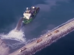 專(zhuān)門(mén)為填海所研發(fā)的船,船體直接裂成兩半,泥土砂石全流進(jìn)海里